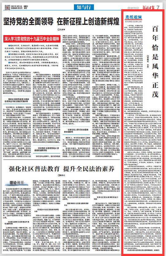 3月3日,《河北日报》知与行版刊发我校(院)党史教研部祁刚利教授、李芬副教授署名文章《百年恰是风华正茂》。原文如下: