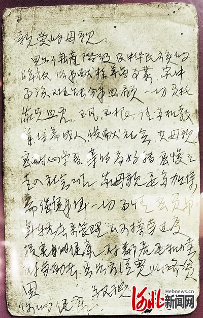当日,记者赶赴晋冀鲁豫烈士陵园看到了那封家书——土黄色一片小纸,磨损的边角显示它不知被翻看了多少遍,而清晰的字迹又能让人读出它的主人是怎样小心翼翼地珍藏。