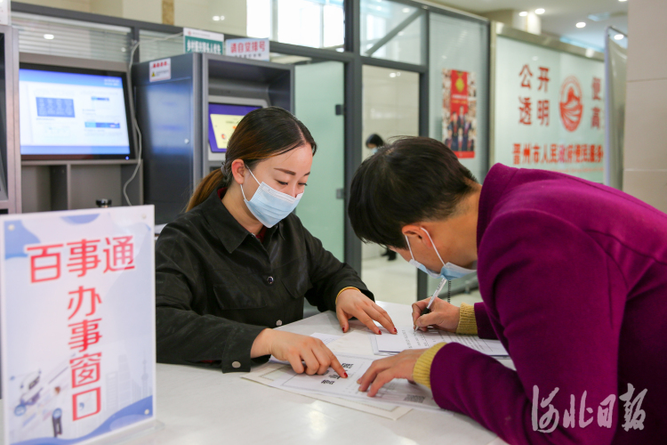 10月27日,晋州市行政审批局便民服务大厅内,工作人员在帮助群众办理工商营业执照。河北日报通讯员贾再兴摄