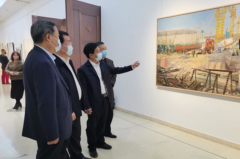 4月1日上午,由河北省委宣传部、河北省文联主办的“启航新征程·放歌新时代”雄安新区建设发展成就书法美术摄影展在石家庄开展。图为河北省文联领导参观展览现场。