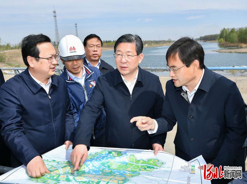 4月13日至14日,省委书记、省人大常委会主任王东峰在雄安新区调研检查。省委副书记、省长王正谱参加调研检查。这是王东峰在白沟引河和白洋淀百淀联通、清淤疏浚工程现场,详细了解相关工作情况。河北日报记者赵威摄