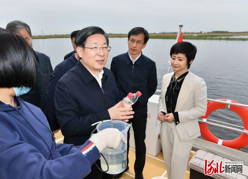 4月13日至14日,省委书记、省人大常委会主任王东峰在雄安新区调研检查。省委副书记、省长王正谱参加调研检查。这是王东峰乘船来到白洋淀水质监测点位,现场检查水质。河北日报记者赵威摄