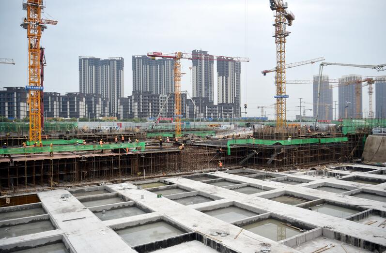 7月18日,中铁二十局的工人在石家庄市高新技术产业开发区集中安置区棚户区改造项目工地施工(无人机照片)。