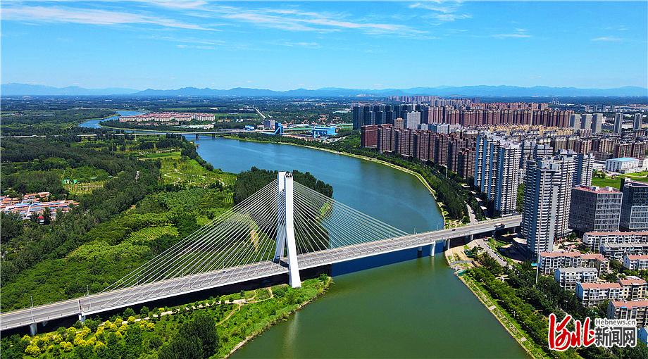 7月14日,航拍飞跨潮白河的燕潮大桥。昔日“断头路”,如今变通途。2019年3月29日,燕潮大桥正式通车后,从燕郊到北京东六环开车仅需15分钟。河北日报记者赵永辉摄