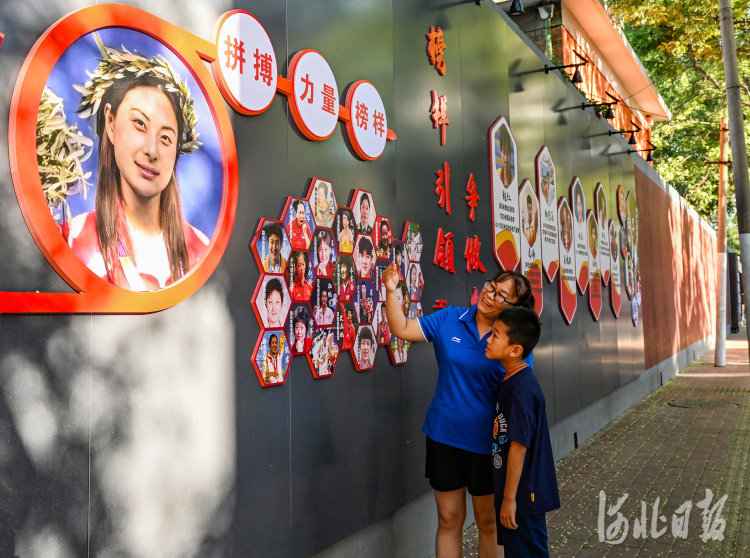 2022年7月17日,河北省保定市民曹海英和孩子一起在位于保定市先锋街的冠军墙前驻足观看。保定市对小街巷进行改造提升,在完成“路平、墙净、便民”的基础上,打造色彩、主题各具特色街巷文化。