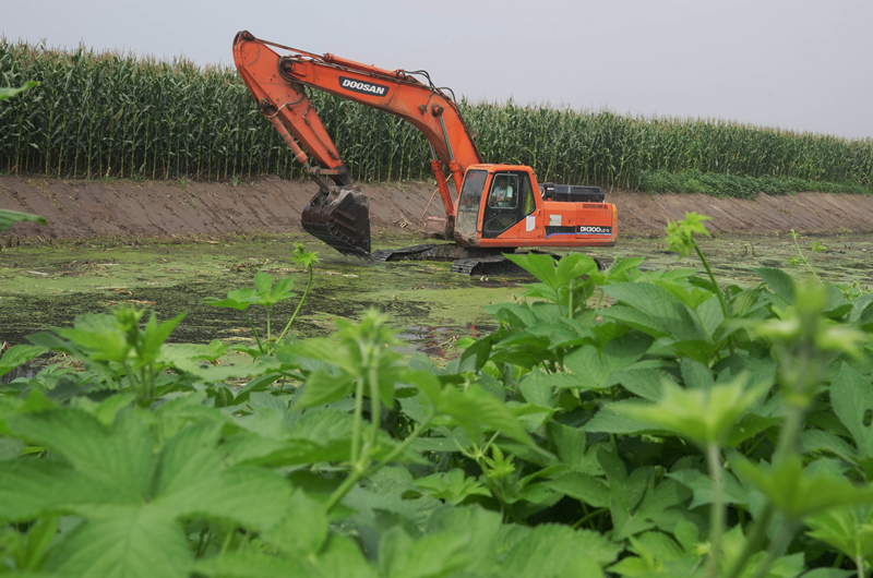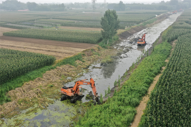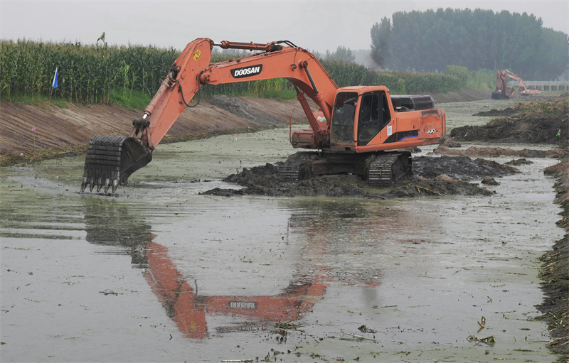 8月5日,工人在昌黎县新集镇境内的引滦河水灌渠清淤现场施工。新华社记者 杨世尧 摄
