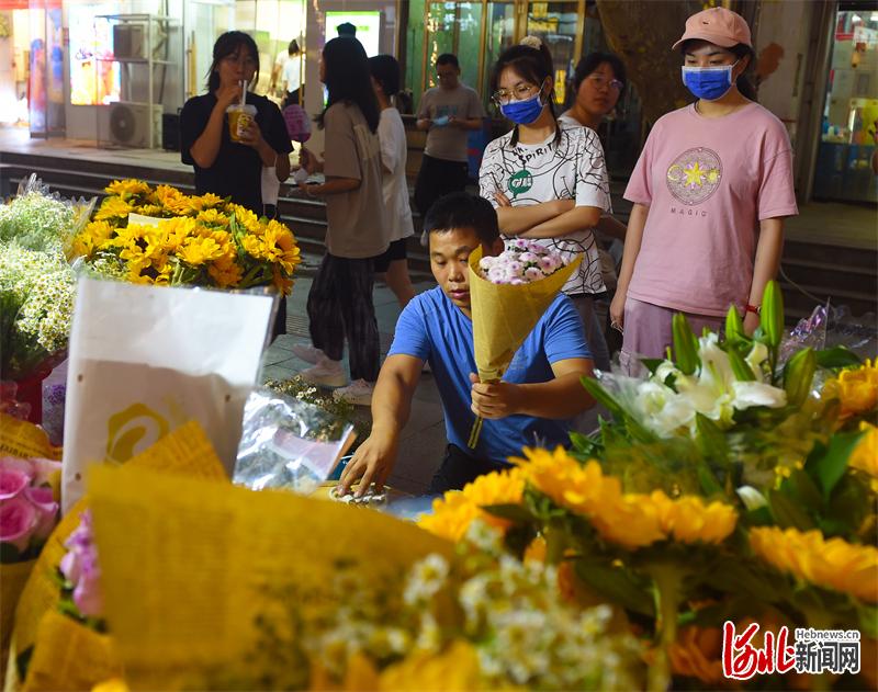 市民在邢台市襄都区天一梧桐步行街夜市选购鲜花。