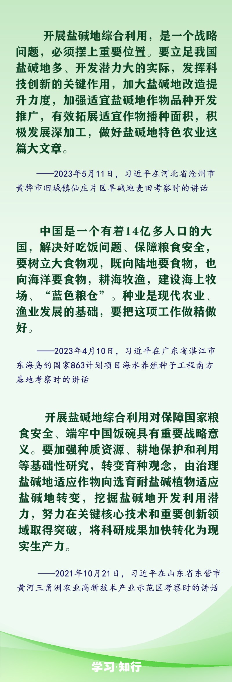 此前,2021年10月,在山东考察时,习近平来到黄河三角洲农业高新技术产业示范区,也曾叮嘱“18亿亩耕地红线要守住,5亿亩盐碱地也要充分开发利用。如果耐盐碱作物发展起来,对保障中国粮仓、中国饭碗将起到重要作用。”