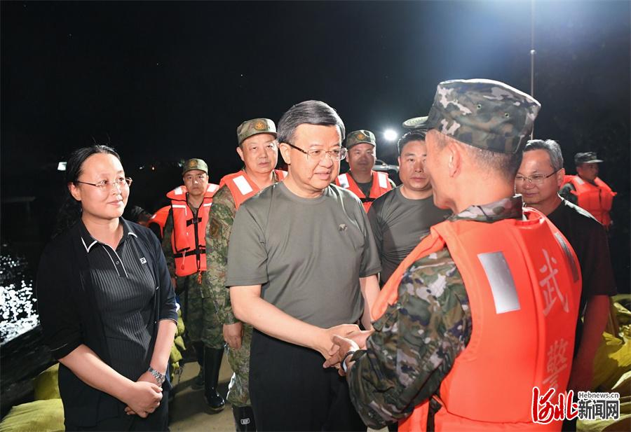 7月31日晚,省委书记、省人大常委会主任倪岳峰到邢台市检查防汛抢险救灾工作,看望慰问一线党员干部、武警官兵和抢险队员。 河北日报记者赵海江摄