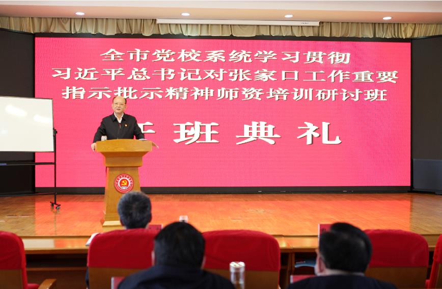 4月9日下午,张家口市党校系统学习贯彻习近平总书记对张家口工作重要指示批示精神师资培训研讨班开班。市委书记回建出席开班式并作专题辅导报告,市委副书记、市委党校校长孙远富主持开班式。