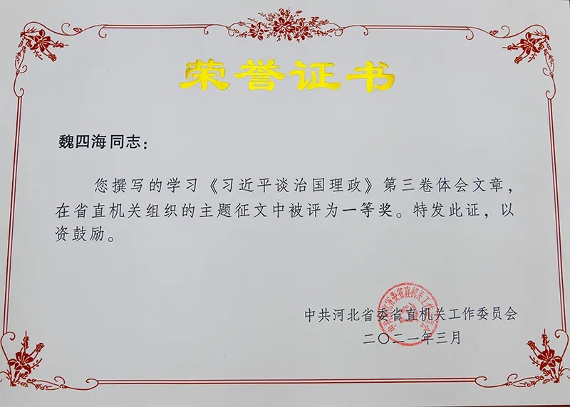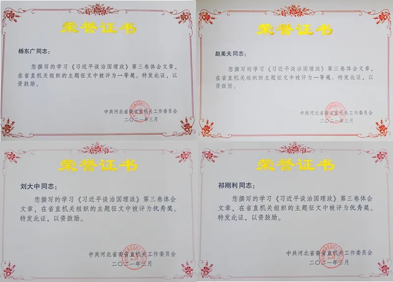 近日,省委省直工委公布了学习《习近平谈治国理政》第三卷心得体会征文评选结果,我校(院)多名同志获奖。魏四海、杨东广、赵美夫3名同志获得一等奖,刘大中、祁刚利2名同志获得优秀奖。