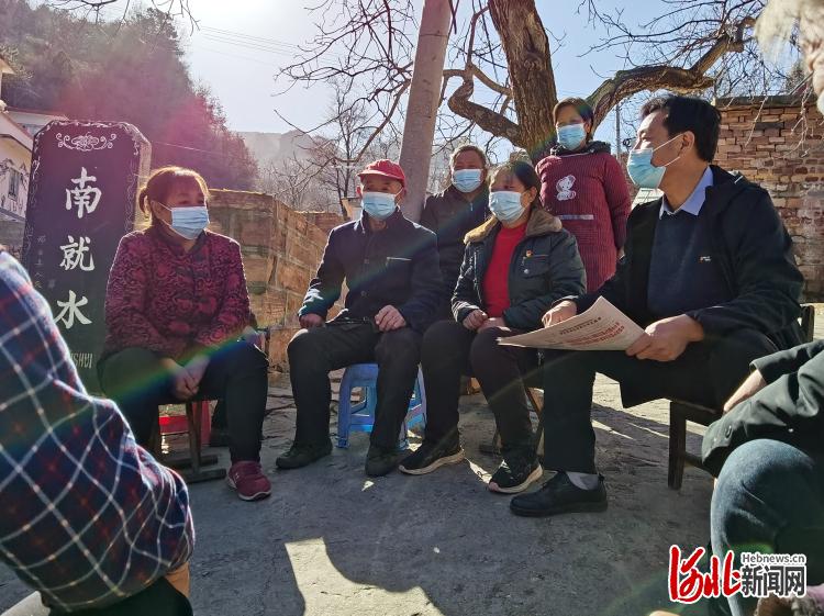 2021年11月25日,在河北省邢台市信都区白岸乡南就水村军工厂旧址前,“小马扎”宣讲员为当地群众宣讲党的十九届六中全会精神。