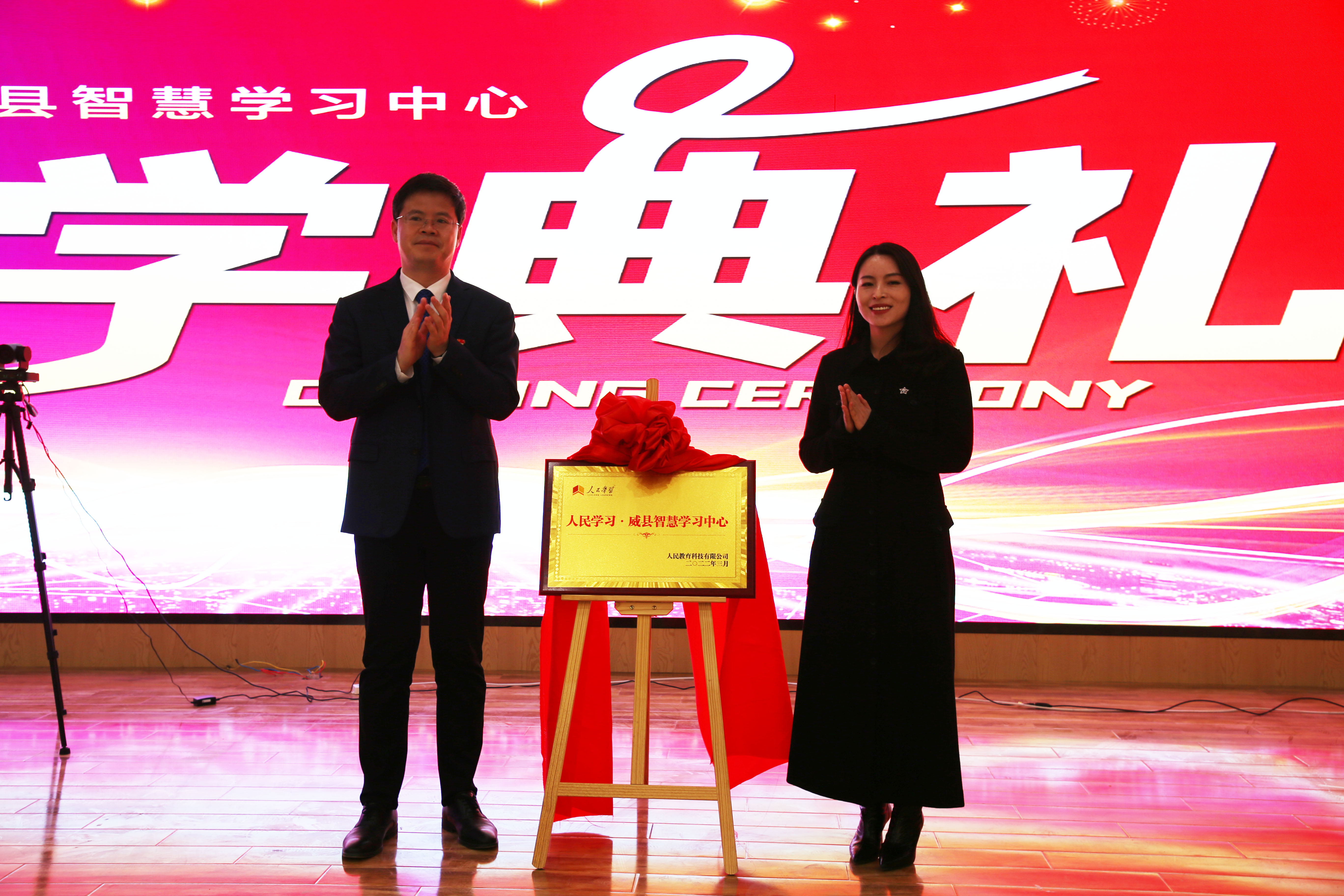 随后,崔耀鹏与陈梅共同为人民学习·威县智慧学习中心揭牌。