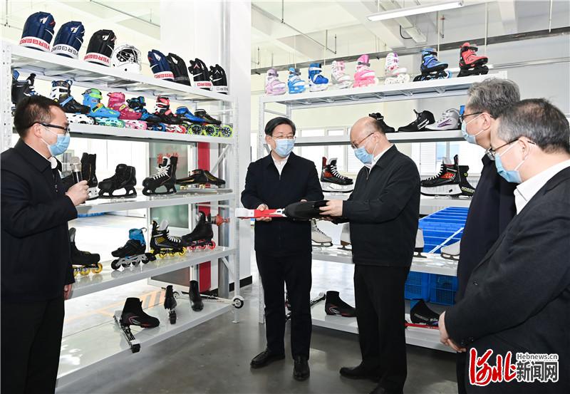 4月16日至17日,省委书记、省人大常委会主任王东峰在张家口市调研检查。省委副书记、省长王正谱参加调研检查。这是王东峰、王正谱在张家口冰雪运动装备产业园,认真察看冰球鞋等生产情况。 河北日报记者赵威摄