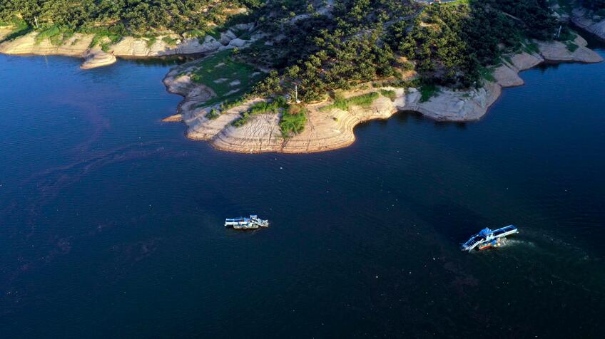 7月18日,工作人员驾驶打捞船在河北省遵化市上关水库进行打捞作业(无人机照片)。