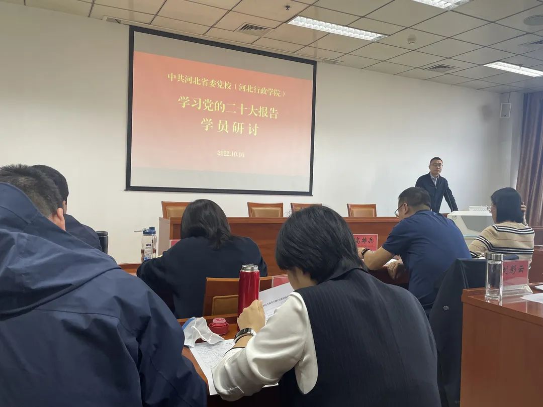县处级干部进修班(第2期)全体学员以小组为单位开展以“学习贯彻党的二十大精神,肩负新使命、再创新业绩,为加快建设经济强省美丽河北作出新贡献”为主题的研讨交流活动。大家联系各自思想和工作实际,讲认识、谈体会、出思路、话发展,进一步深化了对党的二十大精神的理解把握、认识领悟,增强了用党的二十大精神指导实践、推动工作的高度自觉。大家一致表示,在校学习期间要紧密结合课堂教学、党性分析、党日活动、交流研讨等多种渠道和载体,带着思考学、带着问题学、带着使命学、带着责任干、带着收获走,在今后的工作中要把思想和行动统一到党的二十大精神上来,把力量凝聚到党的二十大确定的各项任务上来,为加快建设经济强省、美丽河北作出更大贡献。