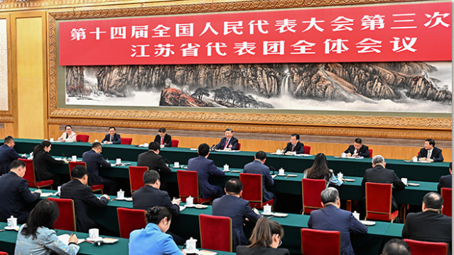 3月5日下午,习近平总书记来到他所在的十四届全国人大三次会议江苏代表团参加审议。 人民大会堂东大厅灯光璀璨,暖意融融。回字形的会议桌旁,代表们踊跃发言,总书记用心倾听。